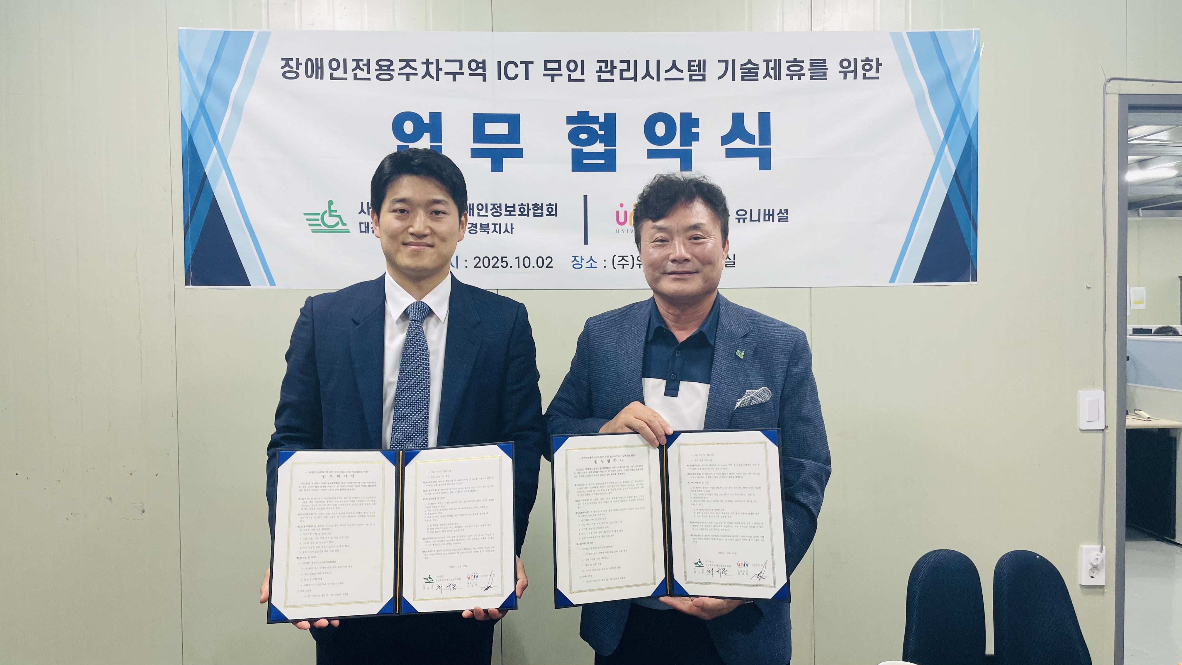 [경상북도협회] 주식회사 유니버셜 [업무협약(MOU)] 체결식 최고관리자 0 20 10.10 11:14 사)한국장애인정보화협회 경상북도협회/대전협회/대구협회 ● 주식회사 유니버셜" 장애인전용주차구역 ICT 무인 관리시스템 기술제휴를 위한 "일 시 : 2025년 10월 2일 오후 2시 장 소 : (주) 유니벌셜 회의실