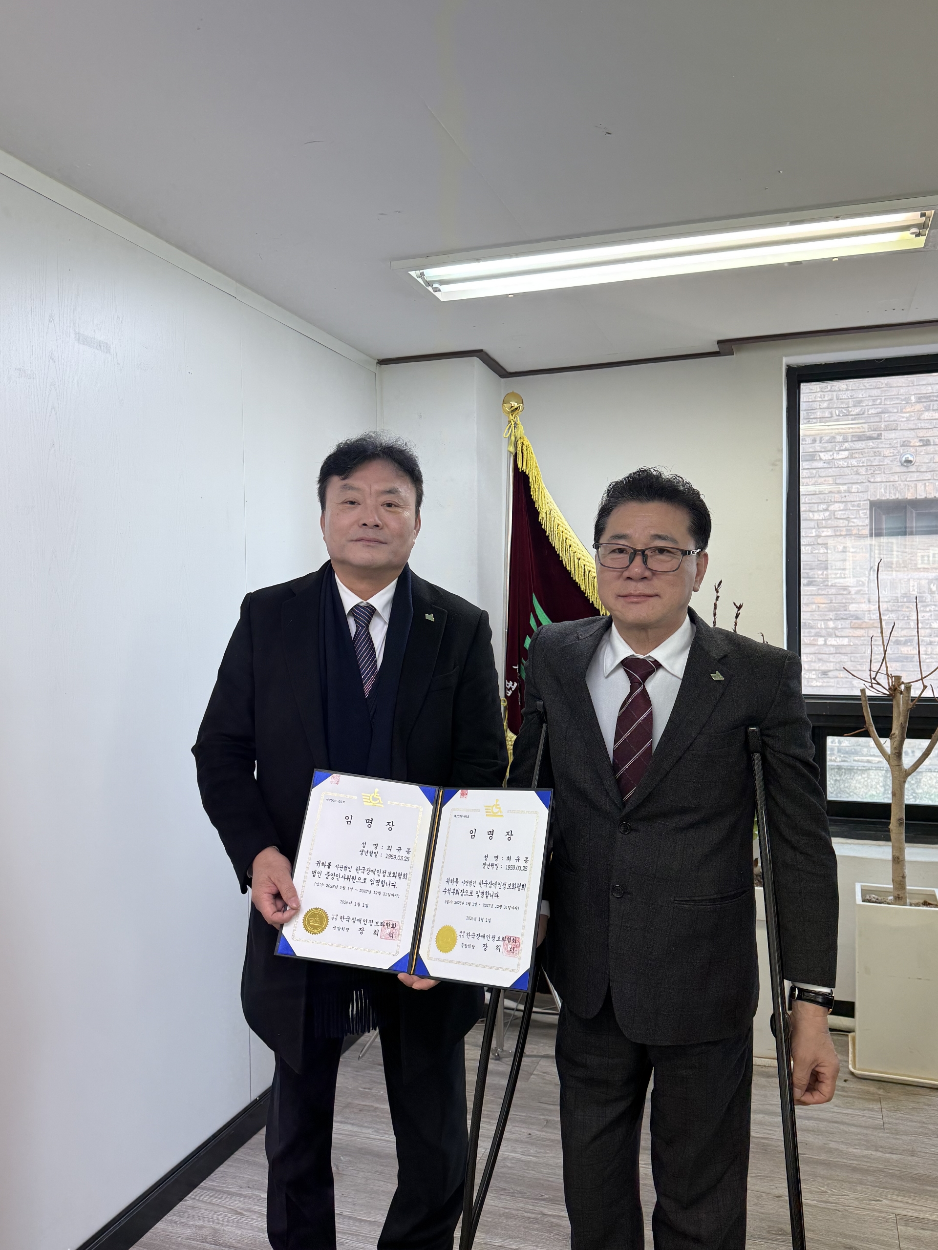 한국장애인정보화협회 중앙회 법인 부회장단 임명식 최고관리자 0 21 01.13 15:42 2026년 1월 8일 (목요일) 한국장애인정보화협회 중앙회 법인 부회장단 임명식서울시 중앙회 사무실